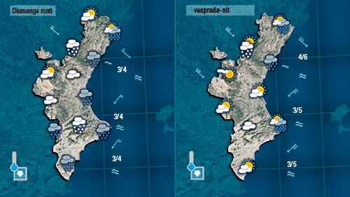 Sembla que els models es decanten per la formació d’un centre de baixes pressions entre les Balears i Catalunya que impulsaria vents de gregal a la mitad sud de la Comunitat a partir de diumenge de vesprada, mentre que al nord seria el mestral el vent dominant.
