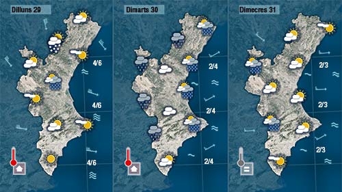 Demà diumenge a la inestabilitat haurem d’afegir el fred que seguirà en augment fent baixar la cota de neu per davall dels 1.000 metres. Fins a migdia els núvols seran a bundants i podrà ploure a la major part de la Comunitat tot i que les pluges més abundants sembla que es registraran al sud. De vesprada el vent acabarà imposant-se de mestral afavorint que els núvols escampen a poqueta nit.