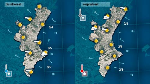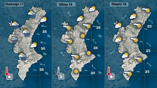 El cap de setmana començarà marcat per les baixes temperatures perquè en encalmar un poc el vent les mínimes tendiran a baixar deixant valors negatius a bona part del nord i de l’interior. Com el dia serà assolellat i el vent no bufarà mab tenta força les temperatures diürnes podran pujar lleugerament, sobretot al centre a la costa i al sud.
