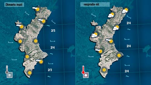 Demà dimarts no tardarem en notar com torna el ponent i amb ell les temperatures tornaran a ser caloroses al centre del dia. Cap a última hora el cel quedarà més ennuvolat a la mitad nord de la Comunitat però difícilment cauran més de quatre gotes.