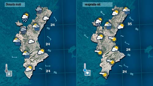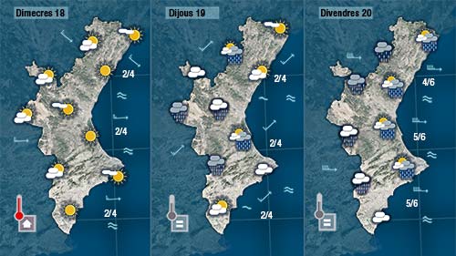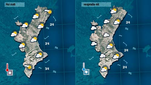 Entre hui i demà el vent serà de direcció més variable i a la costa es deixarà sentir el vent d’origen marítim (el xaloc) aportant humitat des de la mar. Els núvols seran més abunfants que ahir deixant les temperatures nocturnes més altes i les diürnes més baixes.