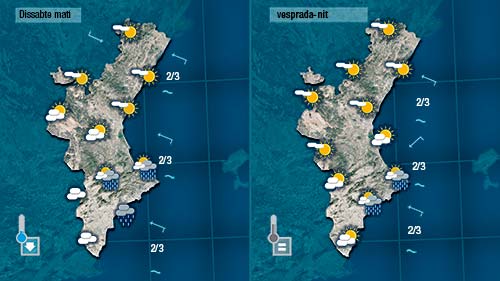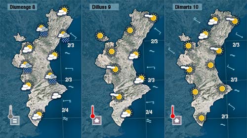 El cap de setmana començarà i acabarà amb més núvols a la mitad sud de la Comunitat on no es pot descartar que puga ploure de forma dèbil i dispersa. Al nord vorem més el sol i tot i baixar les temperatures encara farà caloreta al centre del dia.