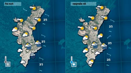 Els núvols es concentran hui de nou a la mitad sud de la Comunitat on no descartem que puguen registrar-se ruixats de caràcter dèbil. Ja comentarem ahir que existia la possibilitat que es formara algun nucli convectiu front la costa del sud de València i a la d’Alacant, però pensem que no és massa probable.