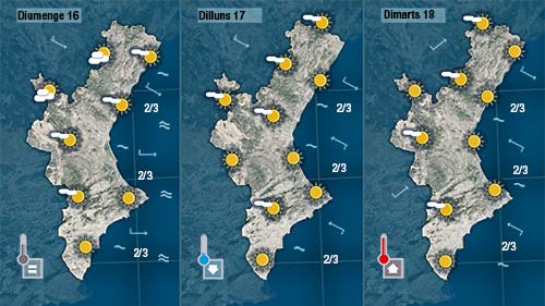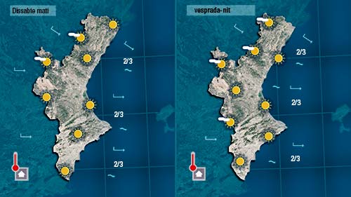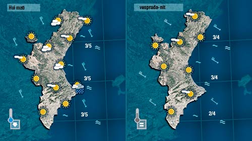 Pot ser a primera hora encara tindrem núvols al nord i en punts de la costa, on només de forma anecdòtica podria registrar-se algun ruixat. Serà el vent qui més destaque en les pròximes hores (ja ha bufat fort durant la matinada). Fins a mitja vesprada bufarà fort el mestral, amb ratxes que podran arribar i fisn i tot superar els 100 quilòmetres per hora al nord de la Comunitat.