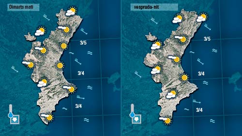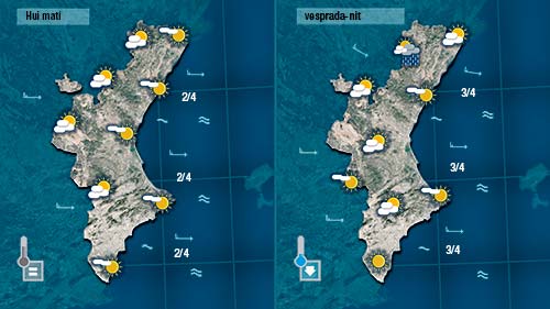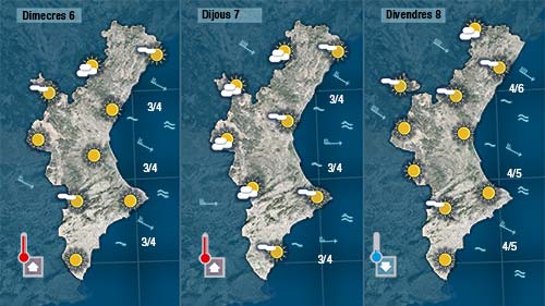 Dimecres i dijous sembla que afluixarà un poc el vent i pujaran lleugerament de nou les temperatures per tornar a baixar divendres quan el vent trone a deixar-se sentir de mestral.