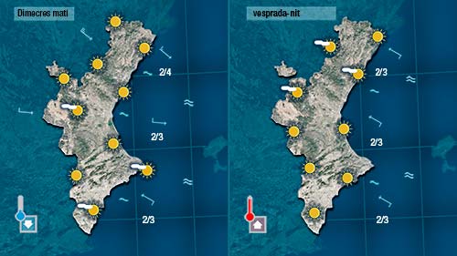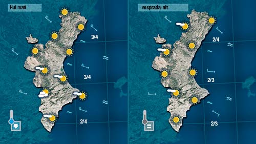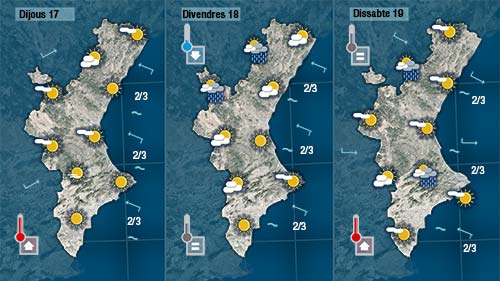 Dijous pujaran un poc tant les temperatures nocturnes com les diürnes i de vesprada augmentarà la nuvolositat al nord i per l’interior. Els núvols creuaran la Comunitat de nord a sud entre divendres i dissabte podent deixar alguna gota al seu pas, sobretot en punts de l’interior.