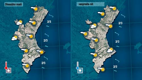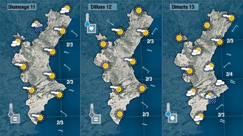 Dilluns el vent serà més humit però més fresc acumulant nuvolositat a la costa. Dimarts continuaran baixant les temperatures i tindrem el cel més ennuvolat a la mitad sud del territori on no es descarta que puga plure dèbilment. En qualsevol cas seran ruixats dèbils (segurament inapreciables) que ràpidament deixaran pas al sol i a temperatures més altes de nou a partir de mitjan setmana.