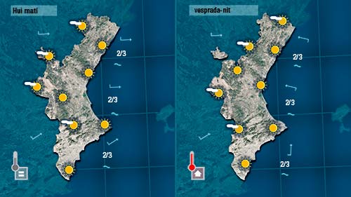 El ponent i el llebeig es deixen sentir des de bon de matí fent que les temperatures pugen de forma progressiva i ‘imparable’ fins arribar i superar els 40 graus en punts del centre de la Comunitat i a les rodalies del Golf de València. Pot ser cap a migdia gire el vent en punts de la costa a xaloc (sud-est) i comencen a baixar les temperatures però pujarà la humitat.