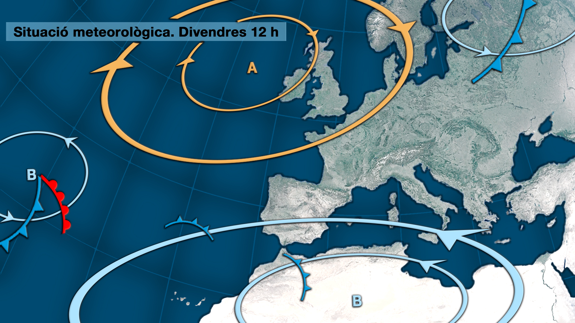 Altes pressions al nord d’Europa. Baixes pressions al nord d’Àfrica. Situació poc definida que ens aporta vents fluixos de llevant i xaloc humits des de la mar