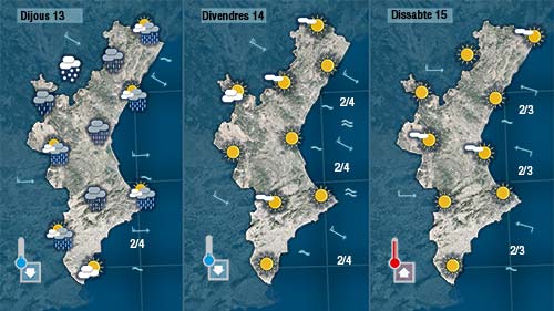 Dijous entrarà la borrasca i el fornt associat des de l’interior deixant ruixats dèbils sempre més probables i intensos a les comarques de ponent i a les del nord. Caldrà seguir la seua evolució perquè a poqueta nit podria donar entrada de vents de tramuntana i gregal amb més recorregut marítim i deixar pluges de més entitat en punts de la costa.