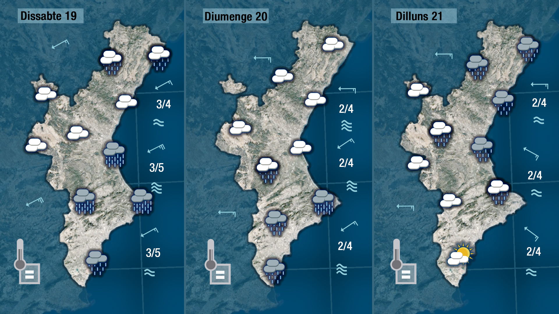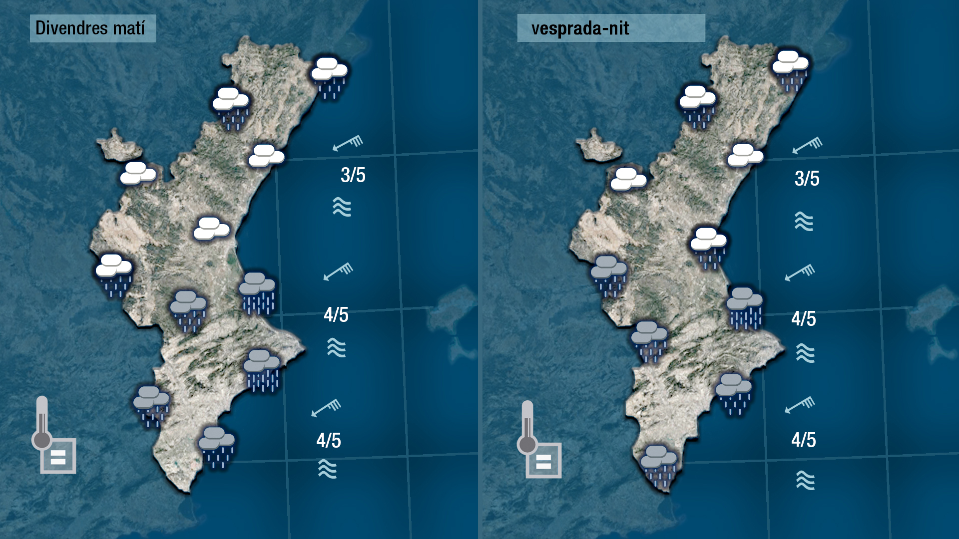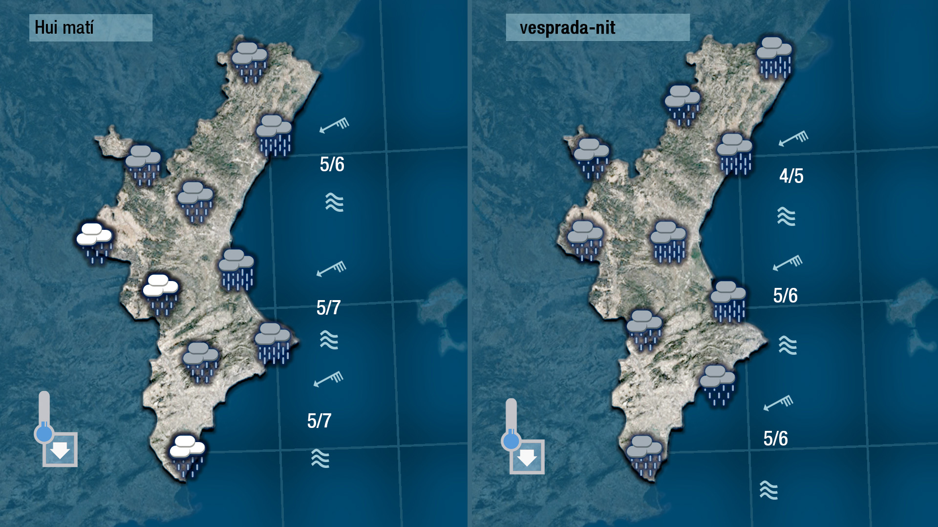 Pot ser de matí ploga dèbilment al sud i a l’interior de València i d’Alacant però les previsions donen pluja general i més intensa a partir de migdia i durant tota la vesprada. L’ambient quedarà hui més fresc, amb temperatures un parell de graus més baixes.