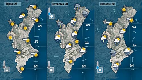 Divendres haurem d’estar atents als possibles canvis. Les previsions donen un matí assolellat i un dia prou calorós però conforme avance la vesprada els núvols es faran més abunants a la mitad nord del territori on els ruixays i les tronades cobraran protagonisme.