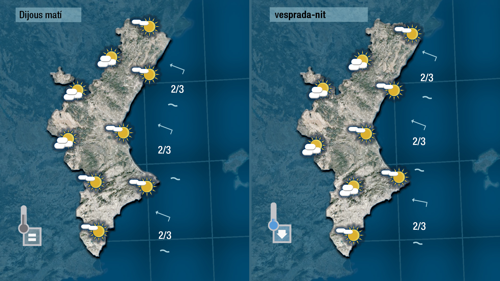 Tampoc cal esperar grans novetats demà dijous. Pot ser tindrem més núvols i això afavorirà un lleuger descens de les temperatures.