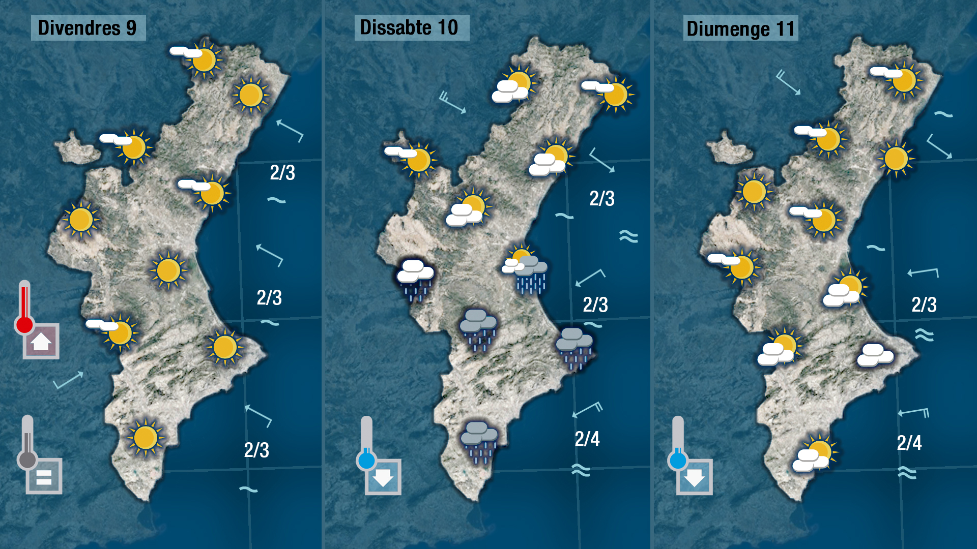 Dissabte podrem disfrutar del sol la major part del dia però caldrà estar atets perquè tot indica que a última hora, i sobretot durant la matinada, l’oratge s’inestabilitzarà deixant pluges que podrien arribar a ser generals a la mitad sud de la Comunitat.