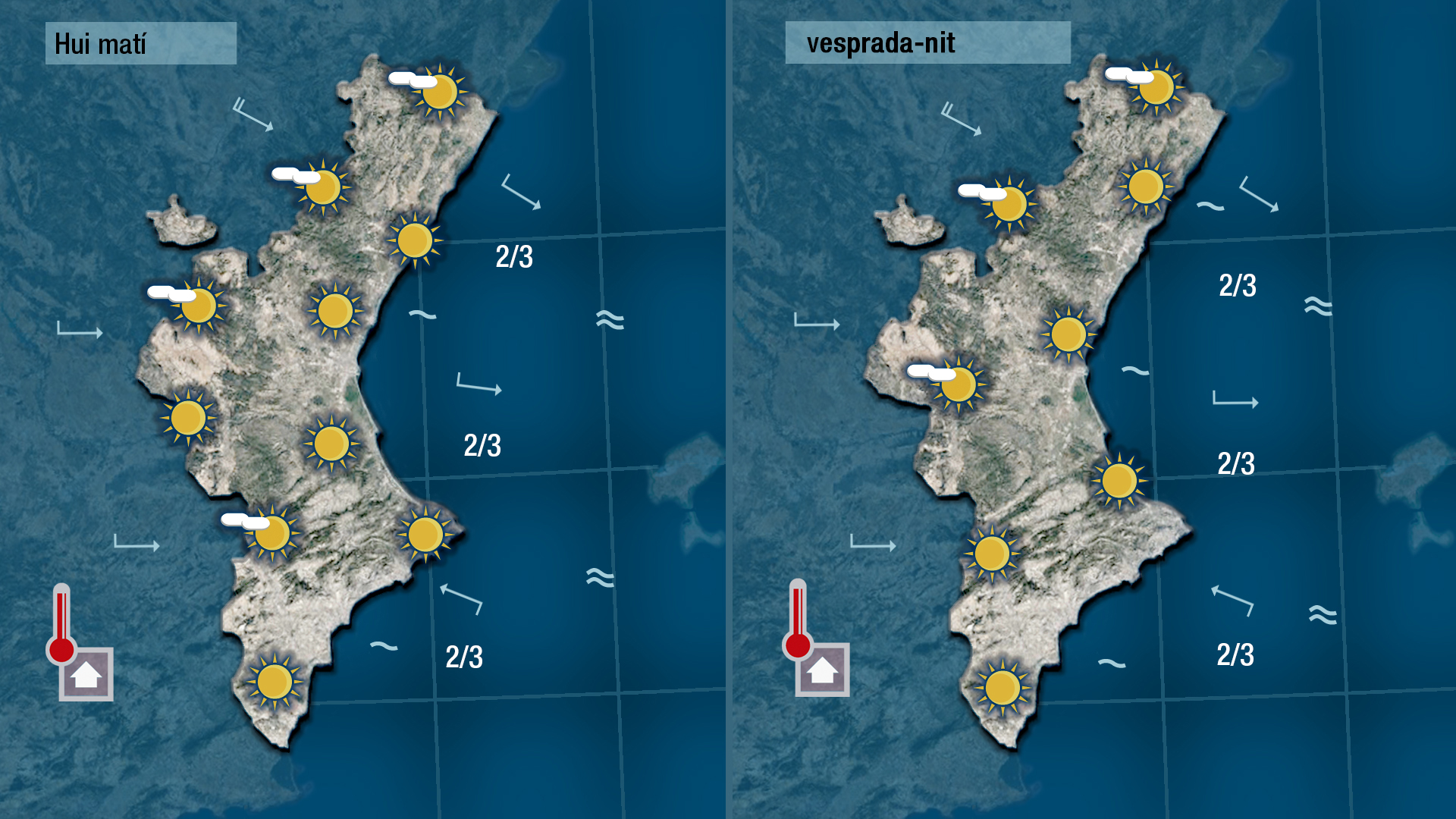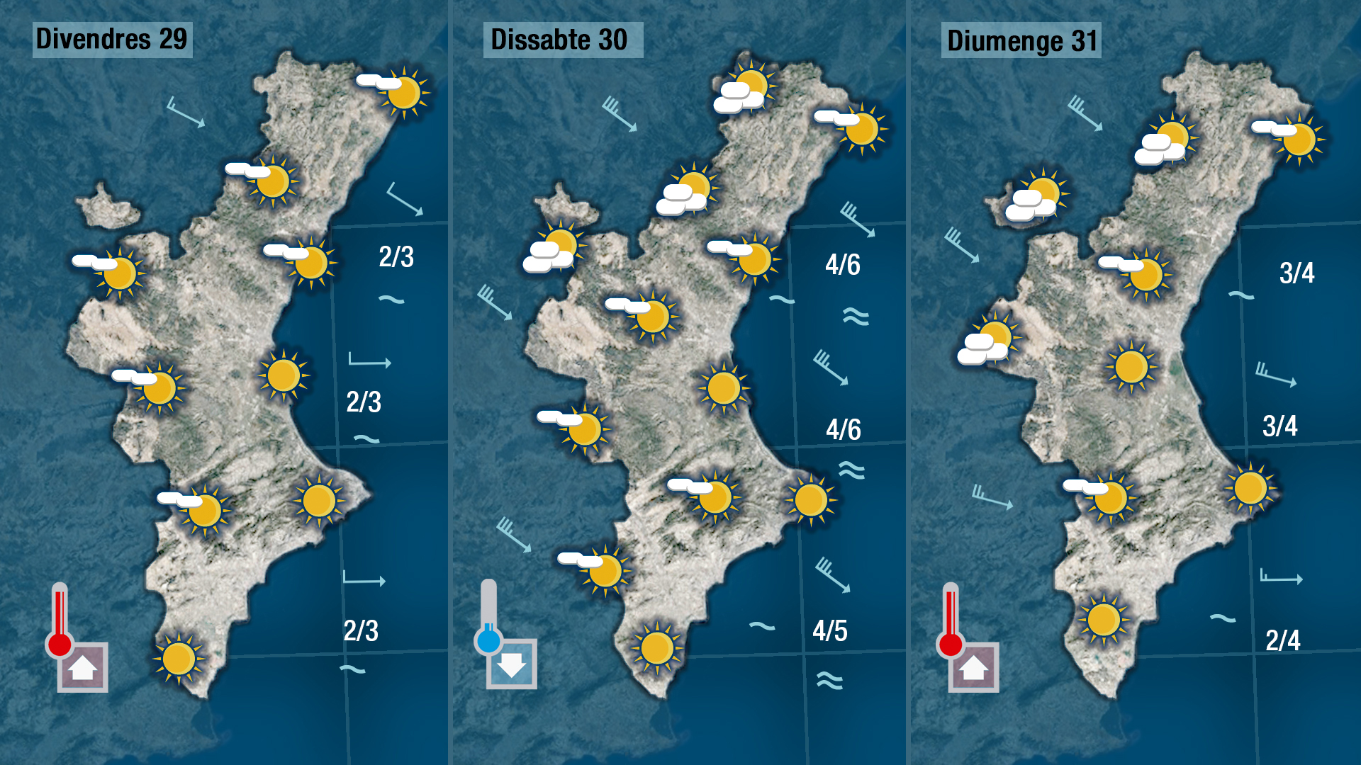 El vent bufarà fuix de ponent encara que en punts de la costa del centre i del sud podrà bufar el xaloc a migdia. L’ambient serà primaveral tant a la costa, on els termòmetres podran tocar els 25 graus, com per l’interior, on s’acostaran als 20.