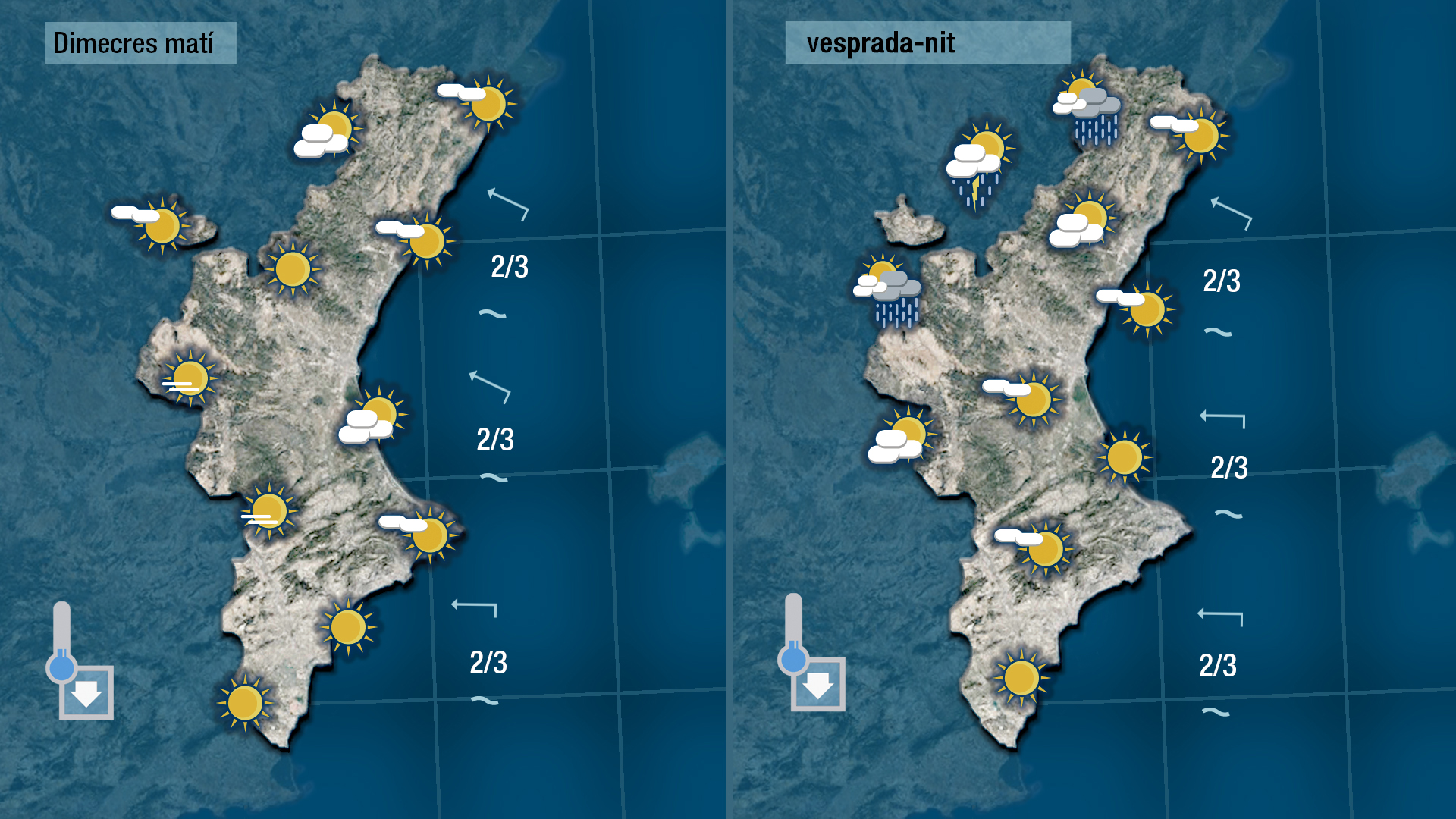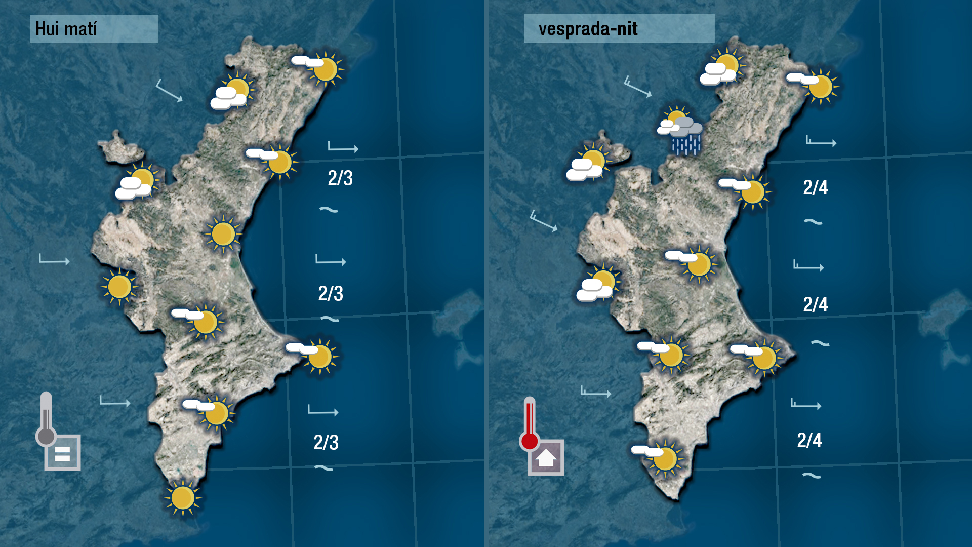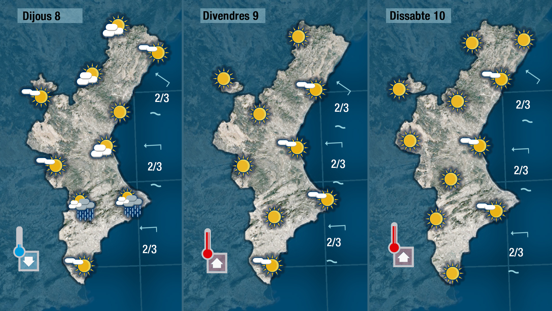 Dijous baixaran les temperatures però el dia serà mot bascós, sobretot en punts de la costa. Fins a migdia tindrem el cel prou cobert i possibilitat de ruixats dèbils al litoral del centre i sud de València i al del nord d’Alacant.