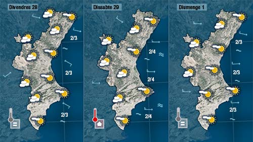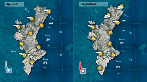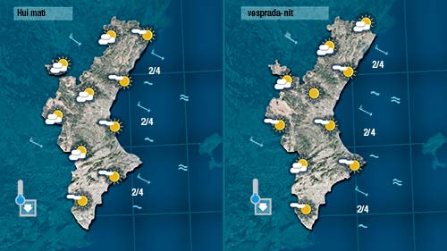 Esta nit l’ambient ja ha sigut més fresc tot i que en aquelles zones on el vent no ha parat el descens ha sigut mínim. Tindren pas de núvols que de tant en tant deixaran el cel més cobert però també vorem el sol. Serà en el valors de les màximes on més notem el descens tèrmic. Les temperatures quedaran al voltant dels 20 graus a la costa, dels 15 per l’interior i al voltant dels 10 al nord.