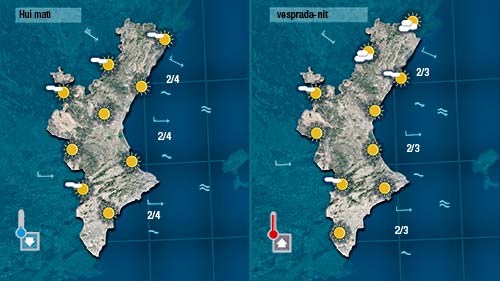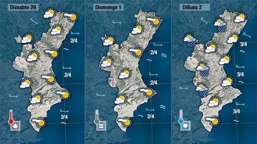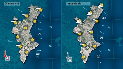 Demà divendres el ponent encara es deixarà sentir fins a migdia però a partir d’eixe moment encalmarà i fins i tot entrarà la brisa a la costa on les temperatures baixaran un parell de graus. A la resta de la Comunitat les temperatures no patiran canvis o pujaran lleugerament.