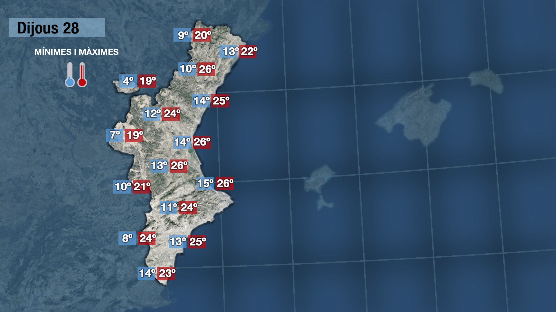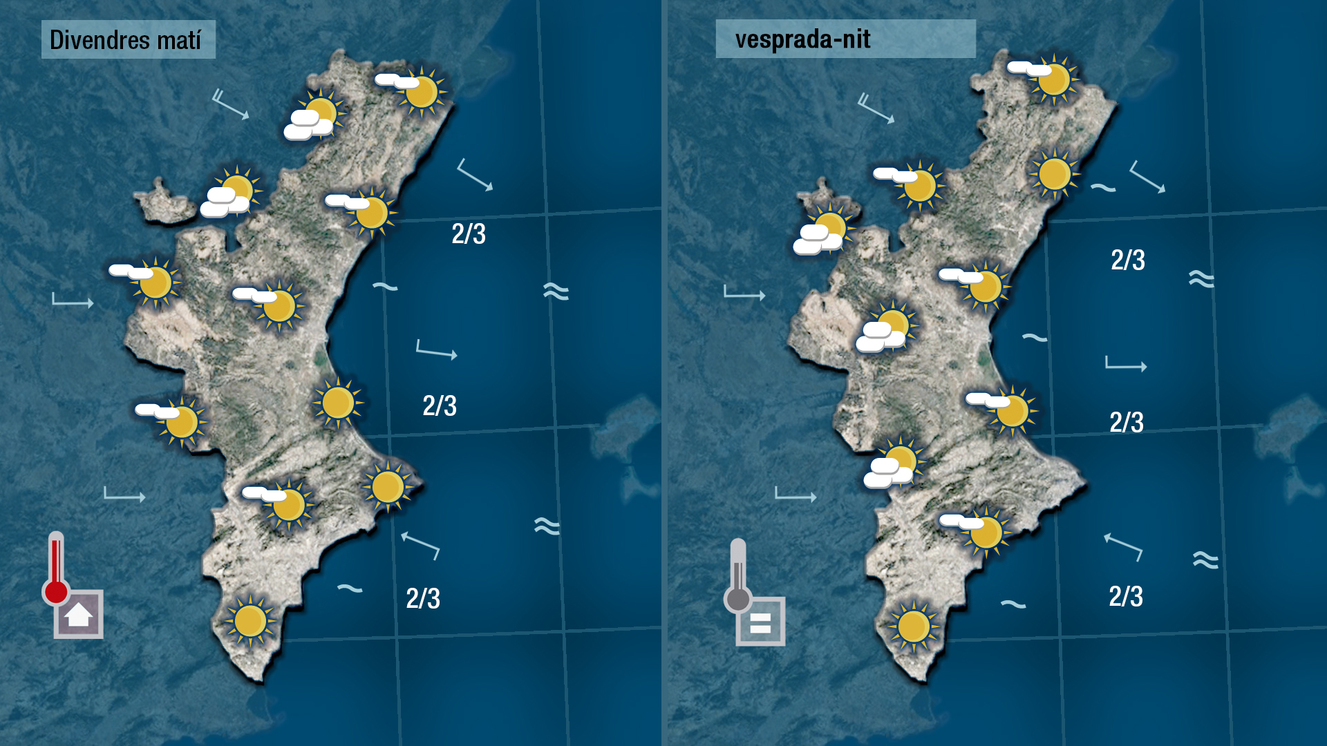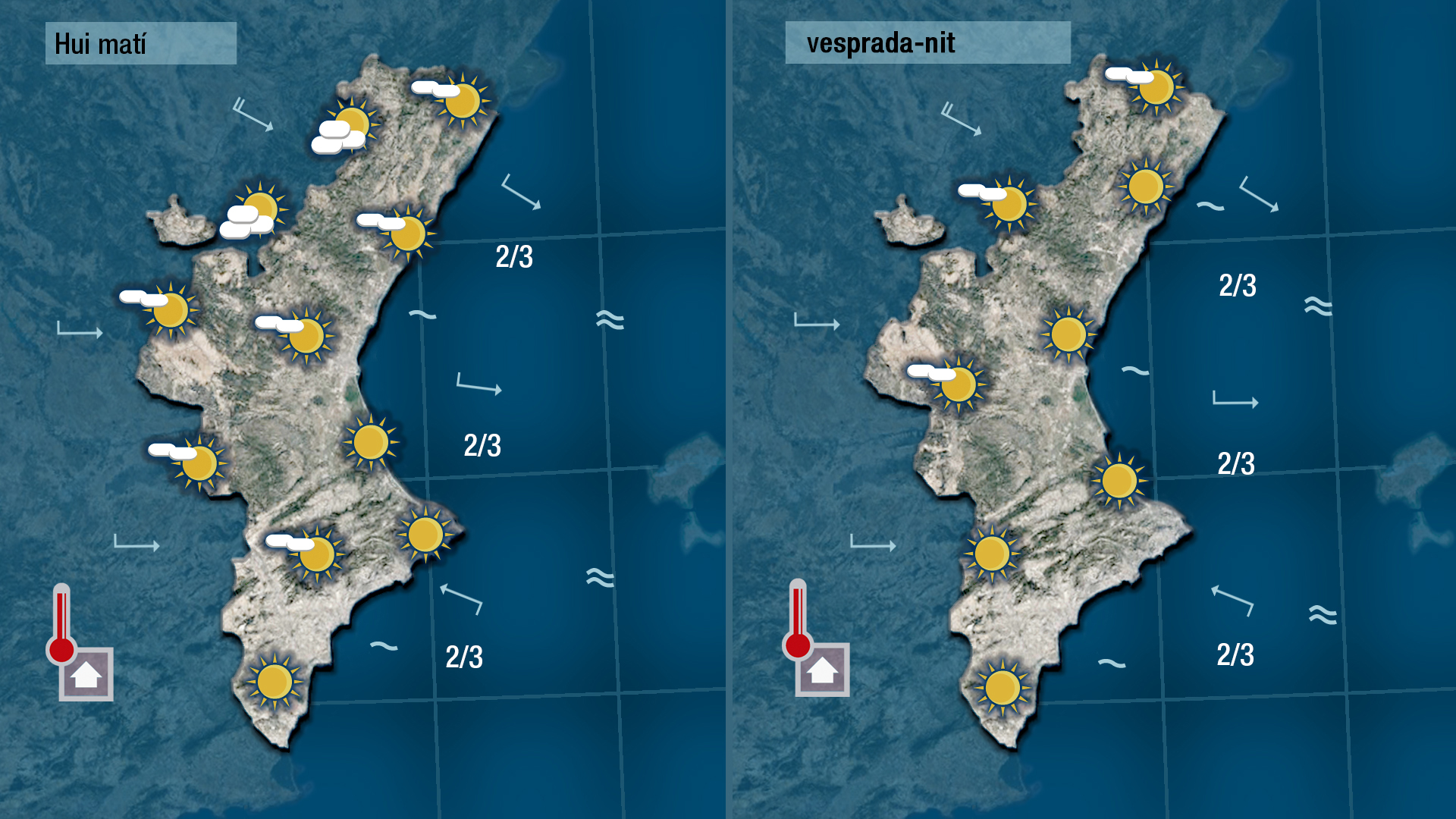 Hui encara cal esperar que pugen un parell de graus les temperatures, sobretot a les comarques més centrals perquè a la costa si acaba entrant la brisa del sud-est no pujaran tant.
