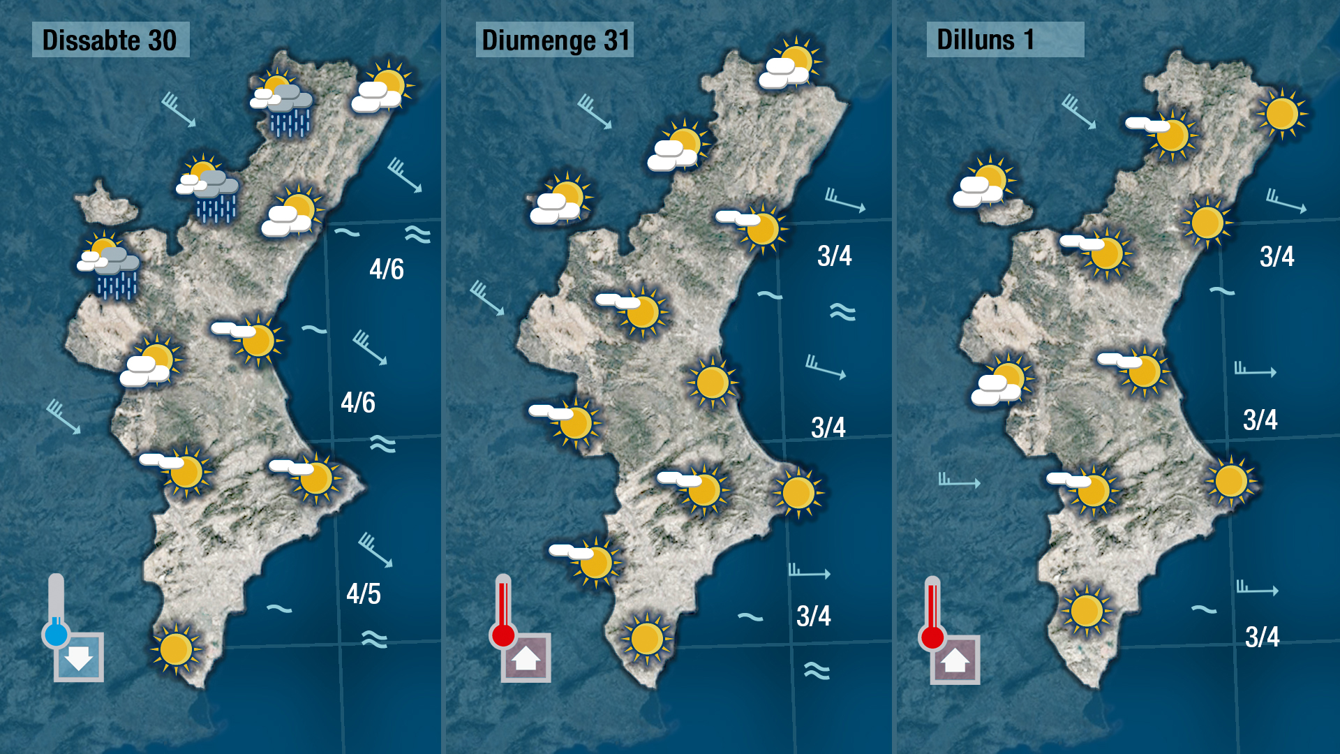 Dissabte ens creua un front que portarà vent de mestral i un descens de les temperatures d’esntre 3 i 5 graus. Es registraran encara valors alts per l’època però no tant alts com hui i demà. A més, doumenge i dilluns persistirà el ponent i tornarà a ser més càlid.