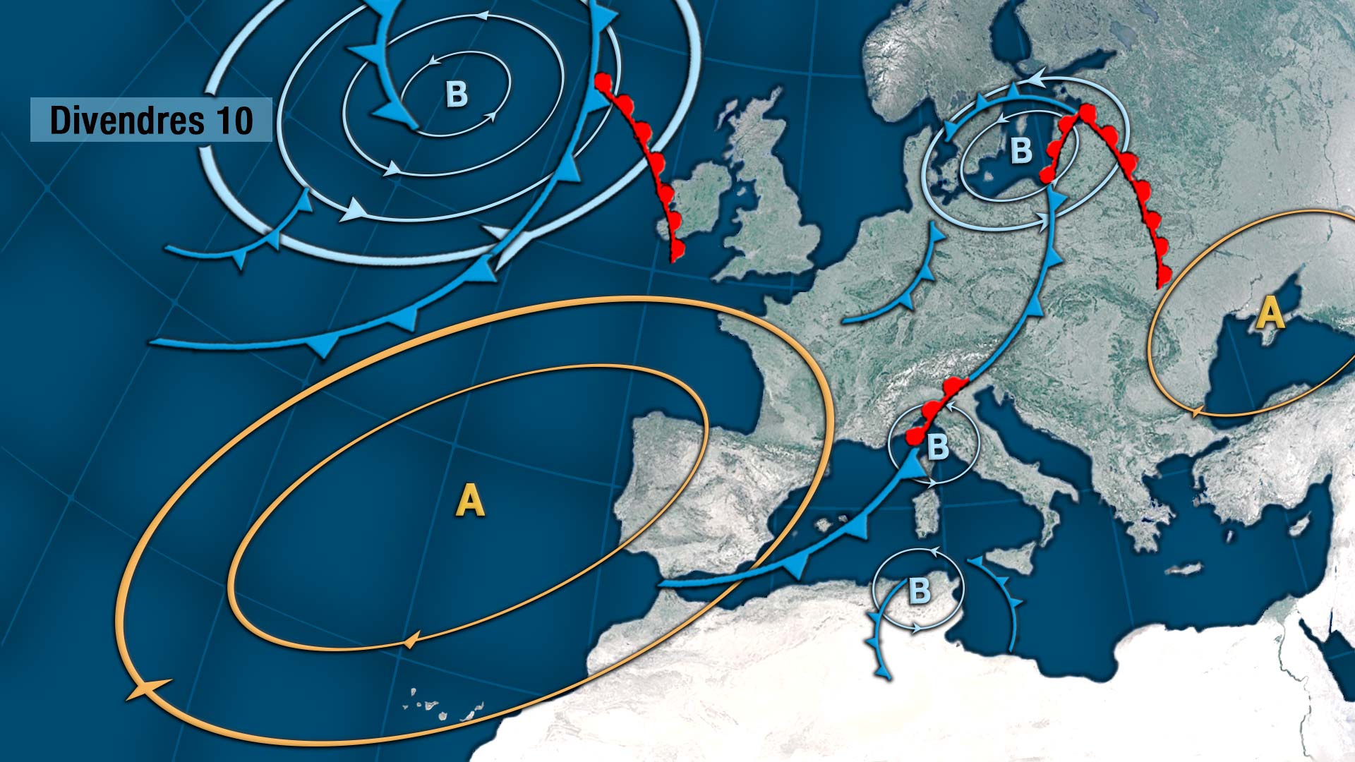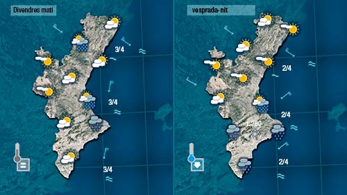 Així queda la previsió per a demà divendres. Un dia que promet tindren’s entretinguts perquè si van cumplint-se les previsions tindrem les primeres pluges de l’any, i pot ser puguem vore també les primeres neus.
