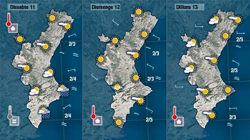 Dissabte de matí encara quedaran núvols al sud, i en punts de la costa podria regstrar-se algun ruixats, però tot indica que a poc a poc tornarà l’estabilitat, es desfaran els núvols i quedarem a l’espera d’una situació més propicia per donar pluges generals i generoses a la Comunitat Valenciana.