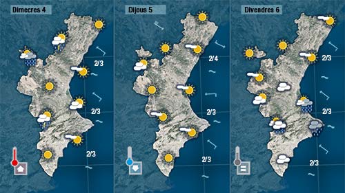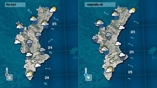 Cal esperar precipitacions que en punts del centre de la Comunitat podran tindre certa intensitat i ser en forma de tempesta. Avançaran de nord a sud. De vesprada la tendència serà a imposar-se el sol però encara quedarà algun ruixat i pot ser alguna tronada residual.