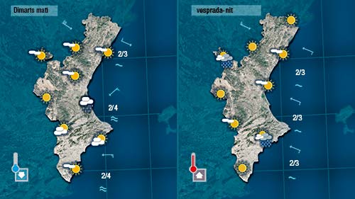 Demà dimarts a primera hora encara quedaran núvols a la costa on podrà caure alguna gota. El sol serà qui predomine a la major part del territori tot i que de vesprada podria creixer algun núvol amb certa energia al nord de València i al prelitoral del nord d’Alacant. Les temperatures pujaran al centre del dia.