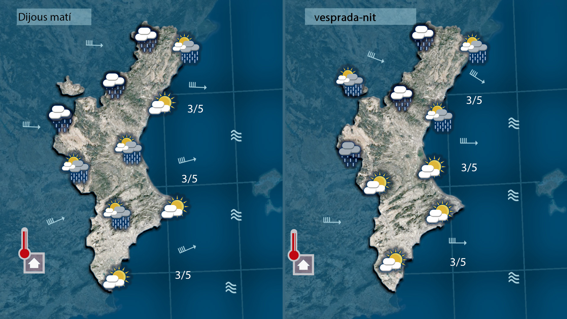 Demà dijous tornarà a ser un dia de núvols de passada que desfilaran d’oest a est deixant el cel cobert i pluges dèbils però la massa d’aire que acompanya els núvols serà prou càlida deixant les temperatures altes al centre del dia