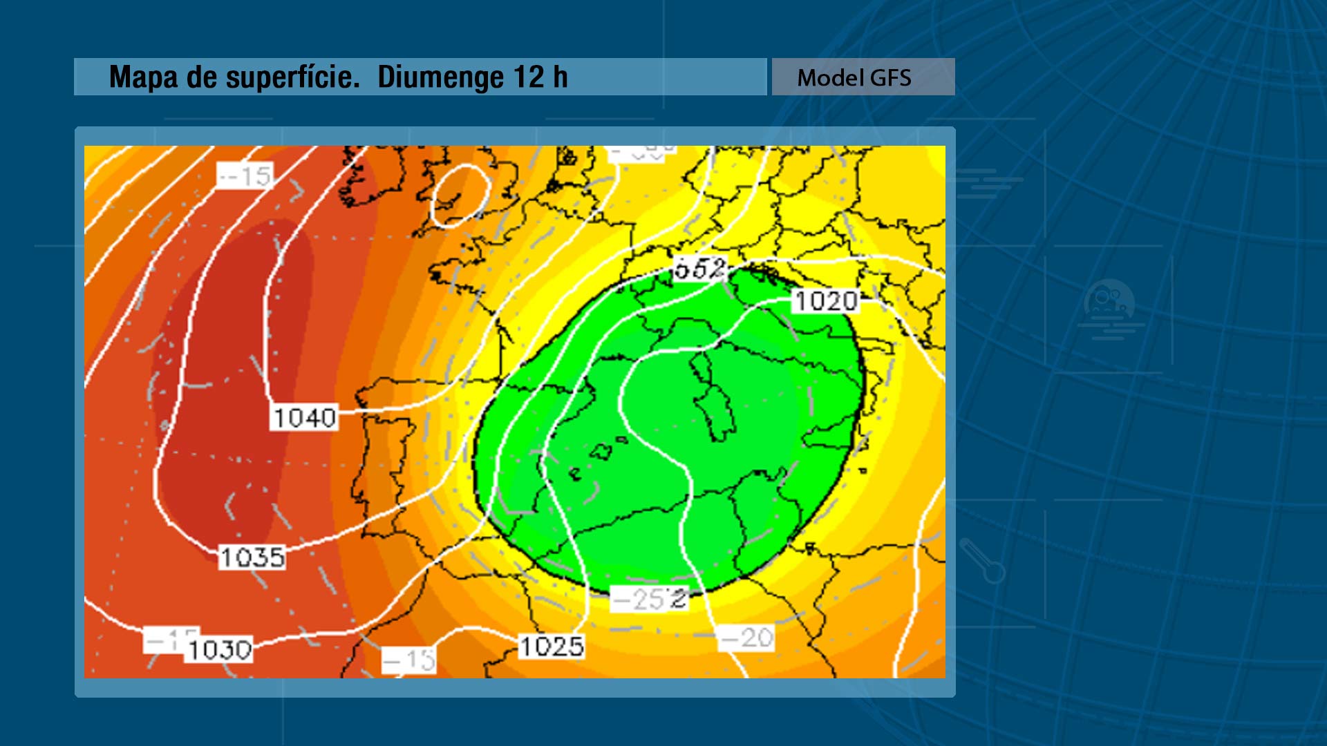 En canvi, el model europeu (ECMWF-European Center Mediun Weather Forecast) aposta per la formació d’una borrasca al sud de la Península alimentada pel llevant que aportarà l’anticicló que acabarà situant-se al centre d’Europa.