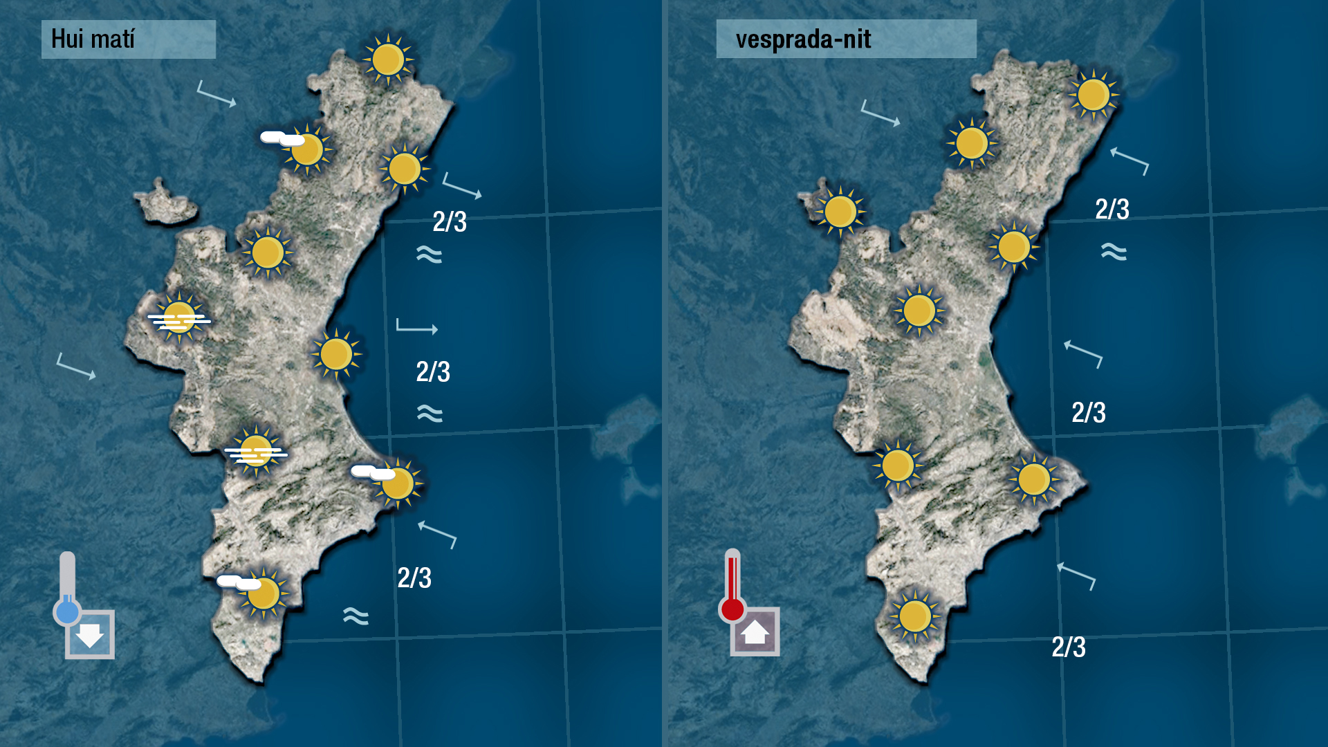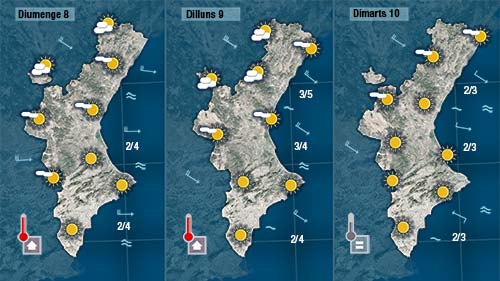 Tret d’algunes boires i dels núvols baixos que tenim a primera hora del dia podrem disfrutar hui del sol a tota la Comunitat, i encara que les temperatures nocturnes han baixat (el cel estava ras i el vent quasi encalmat) les diürnes pujaran.