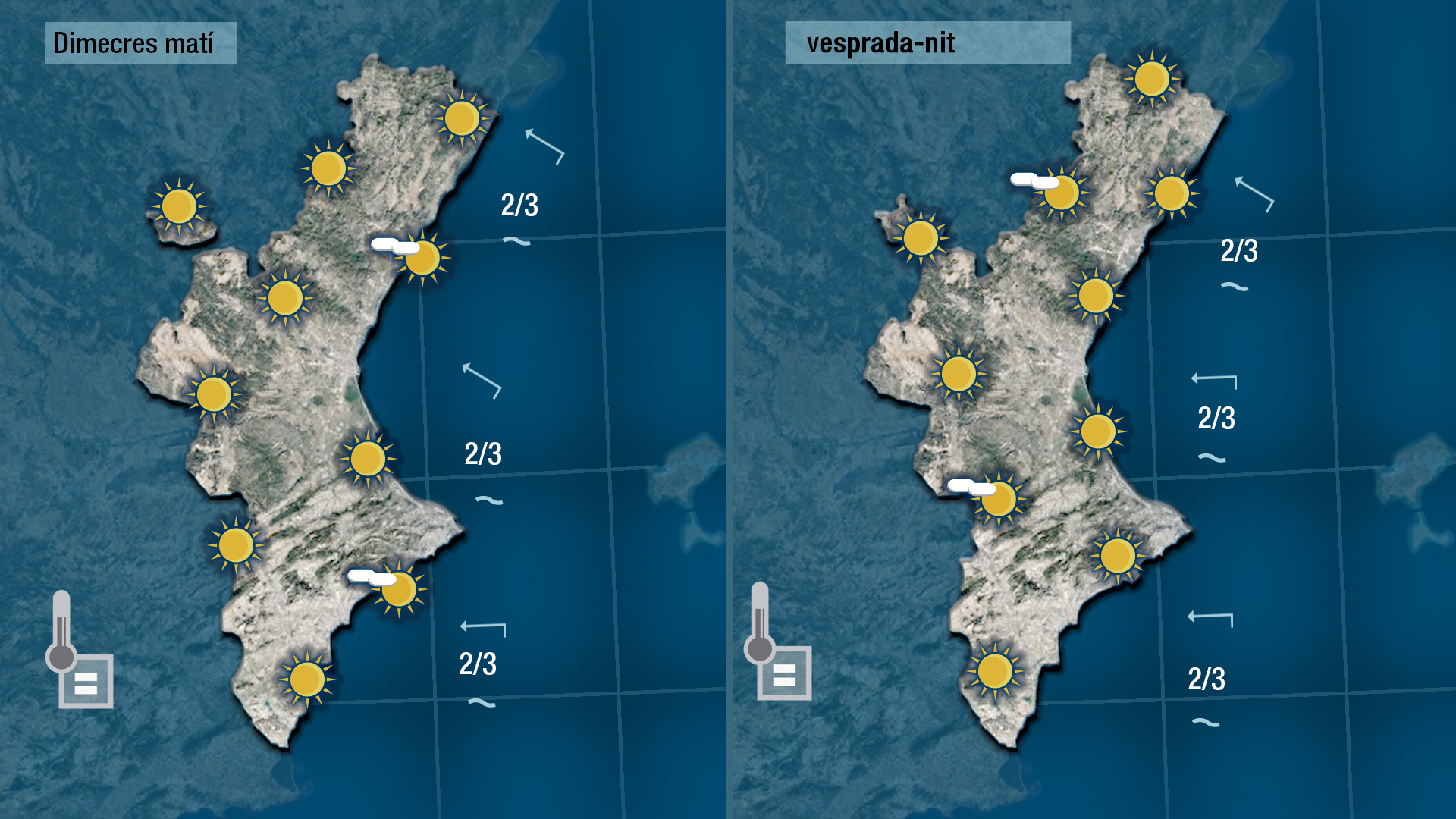 Demà dimecres tampoc vorem massa núvols. Alguns sovintejaran la costa a primera hora i de vesprada es voran alguns en punts de muntanya. Les temperatures, grau amunt graua avall, quedaran sense canvis.
