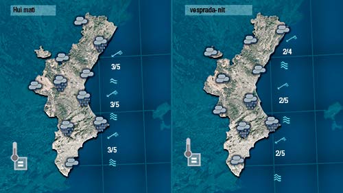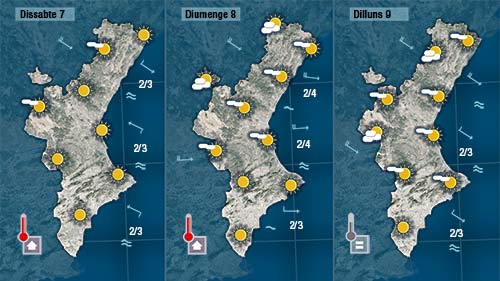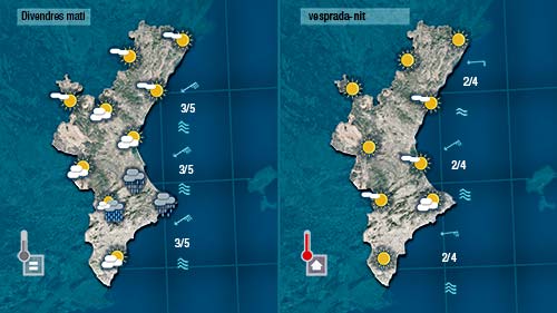 Encetem demà divendres un llarg cap de setmana. Fins amigdia encara cal esperar algun ruixat al sud de València i al nord d’Alacant, més probables quan més aprop de la costa, però a poc a poc es deixarà vore més el sol i les temperatures començaran a recuperar-se