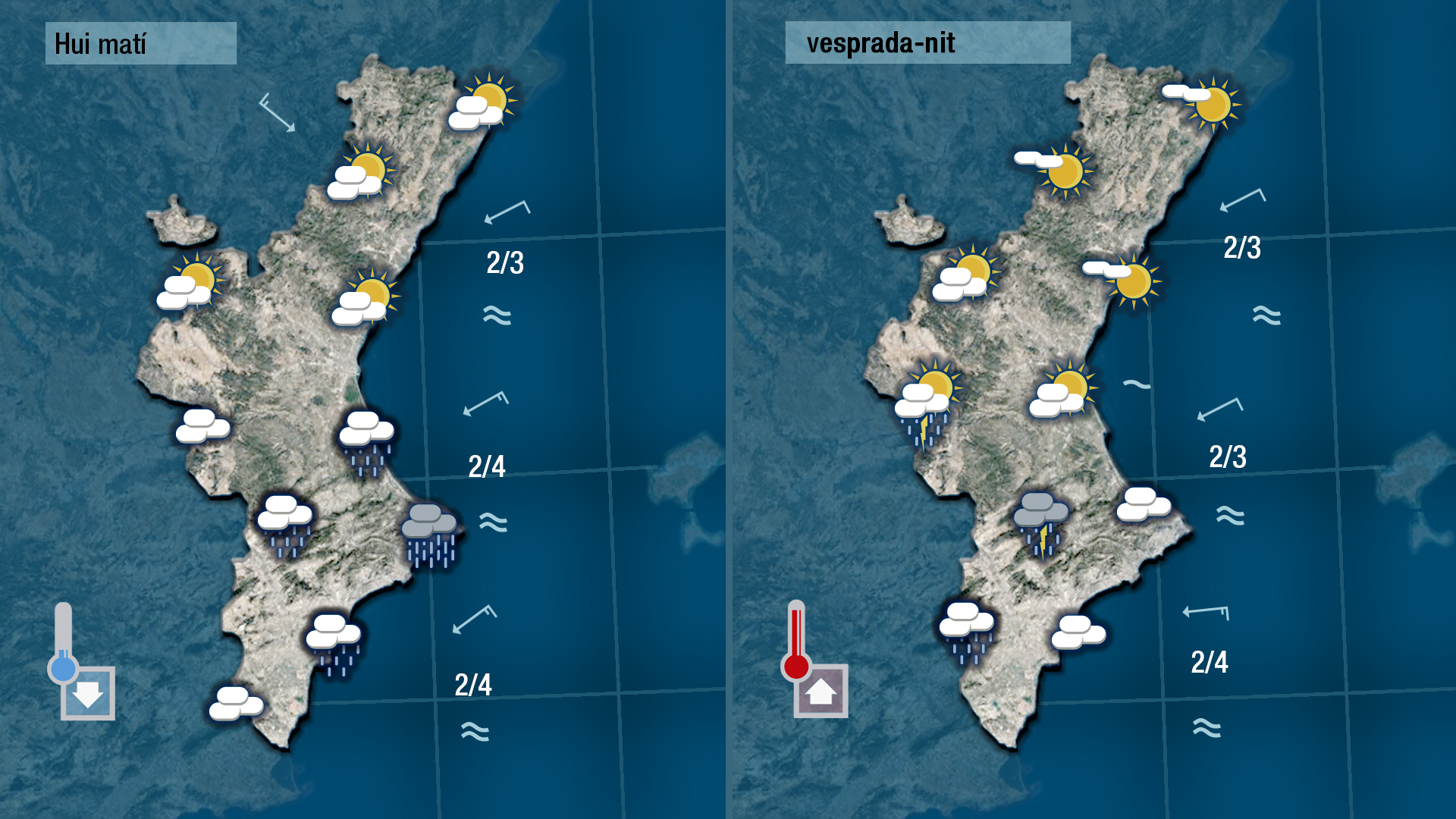 Ahir de vesprada encara tinguerem ruixats de certa entitat i hui caldrà tindre també el paraigua a mà perquè durant el matí pot ploure en punts de la costa i del prelitoral de la mitad sud de la Comunitat, i de vesprada els models de previsió donen una probabilitat prou alta perquè es formen núvols de tempesta a les zones de muntanya del sud de València i a les del nord d’Alacant.
