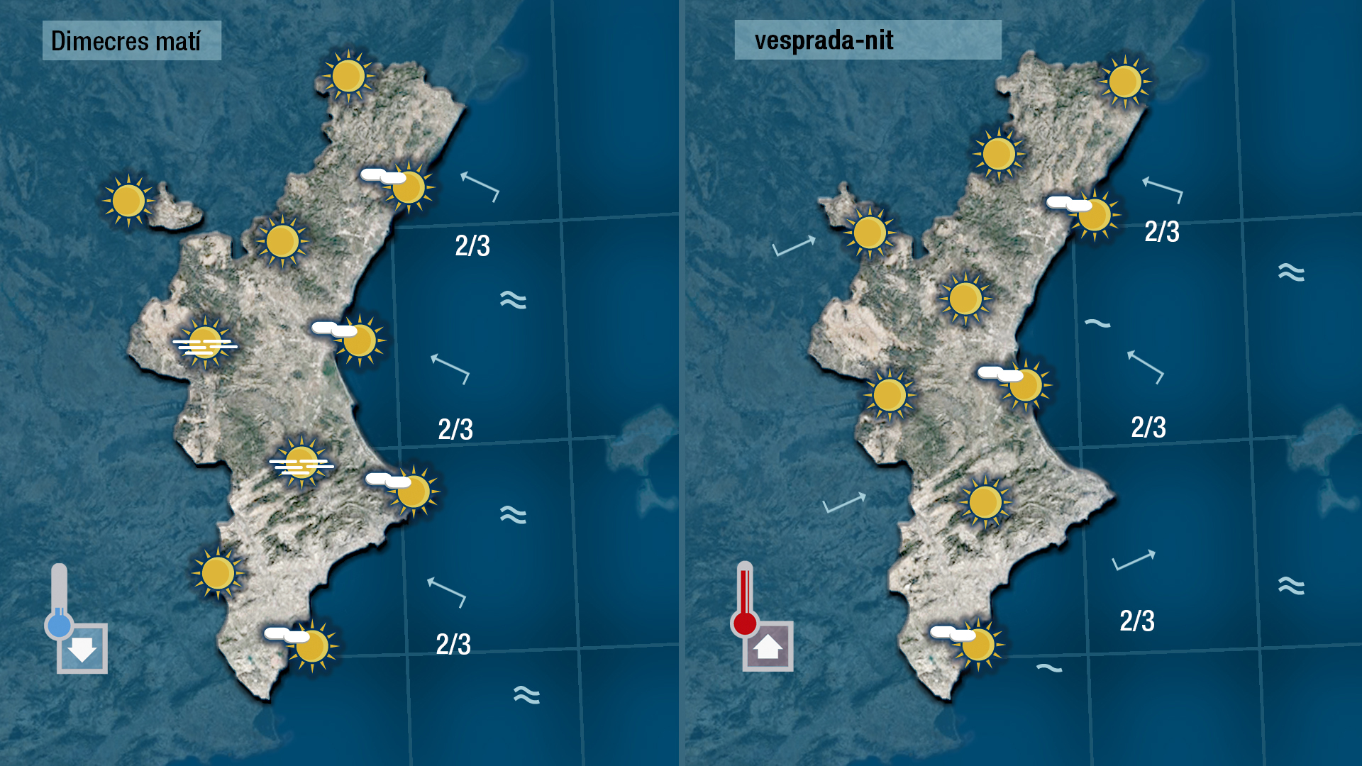 Demà dimecres recuperarem el sol i desapareixerà la inestabilitat. El matí serà ben fresc, fins i tot es registraran gelades en punts del nord i de l’interior, però com que farà sol les temperatures màximes encara podran pujar un poc més.