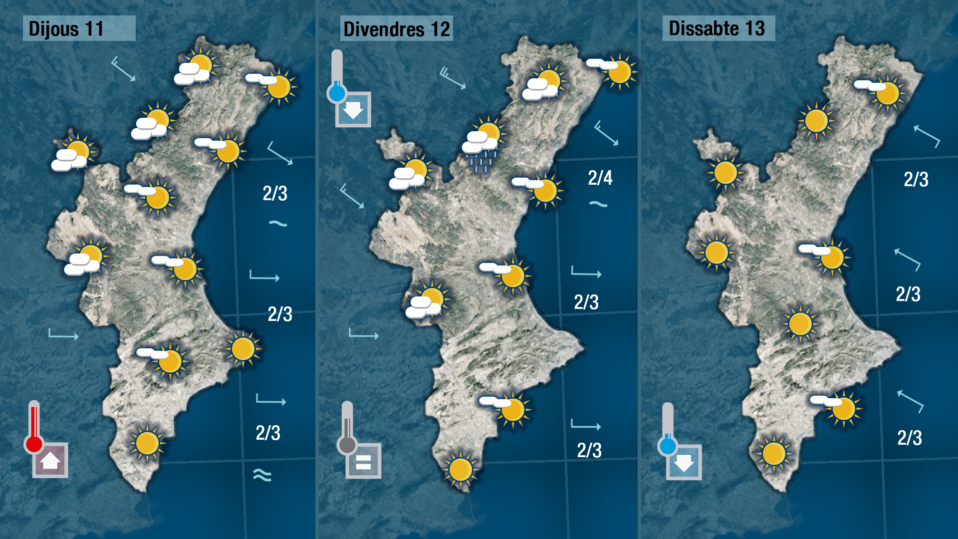 Per dijous i divendres hem d’anunciar vent de ponent que sense bufar amb molta força serà condidor en fer pujar les temperatures màximes fins als 23-24 graus en punts de la costa.