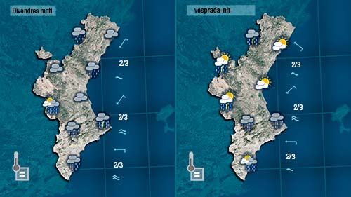 Demà divendres es mantenen les mateixes condicions que hui per donar-nos de nou un dia fresc, gris i plujós a bona part de la Comunitat amb ruixats i tronades de distribició irregular, sempre més probables cap al litoral del sud de València i del nord d’Alacant durant el matí i en punts de l’interior de vesprada.