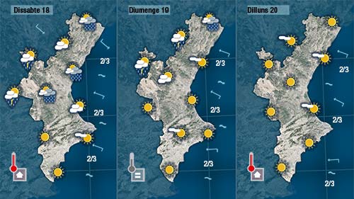 Dissabte i diumenge encara quedaran restes d’inestabilitat suficients com per donar algun ruixat aïllat i tempestes de vesprada però l’oratge serà més estable i les temperatures mostraran una clara tendència a recuperar-se