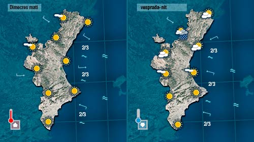 Demà dimecres encara es deixarà sentir el ponent durant el matí deixant més altes les temperatures nocturnes, però al centre del dia notarem un canvi en la direcció del vent. Bufarà de gregal i llevant acumulant núvols i portant un descens de les temperatures de més de 5 graus en alguns observatoris. Fins i tot no es descarta que puga caure alguna gota al nord.