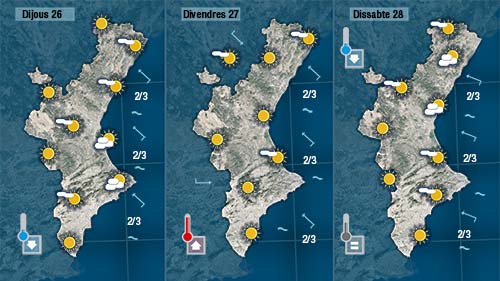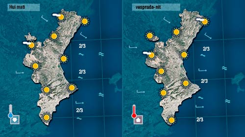 A primera hora pot ser fa la sensació que anem a tindre un dia fresc, típic de tardor, però el ponent que a primera hora encara arriba relativament fresc no tardarà en calfar-se de forma progressiva i imparable fins deixar-nos un dia de ple estiu amb màximes que s’acostaran o superaran els 30 graus a la major part d’observatoris i no quedaran lluny dels 35 al centre i a la costa de les rodalies del golf de València.
