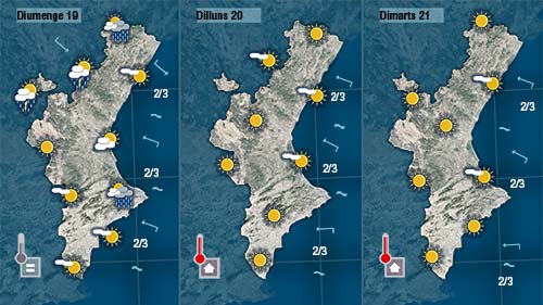 Demà dissabte encara podem esperar ruixats fins a migdia al litoral de La Marina i La Safor on els núvols es trencaran cap a migdia. De vesprada creixeran nuvolades a les zones interrios de València i d’Alacant.