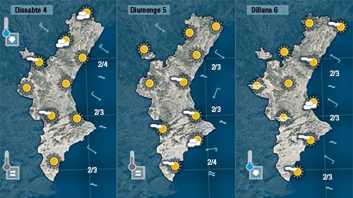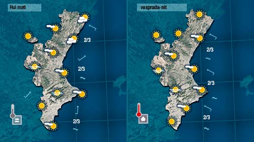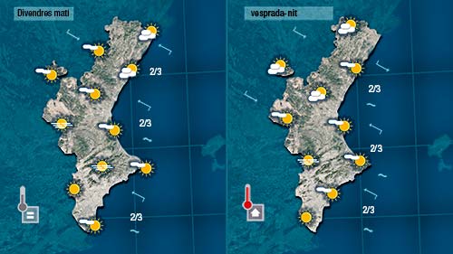 El més significatiu de l’oratge per a demà divendres serà l’entrada de vents de mestral (nord-oest) pel nord de la Comunitat. Tindrem boirines i nuvols baixos a primera hora i núvols mitjans i alts la resta de la jornada.