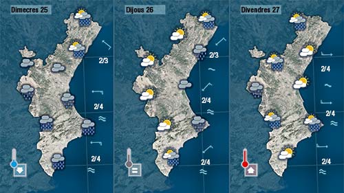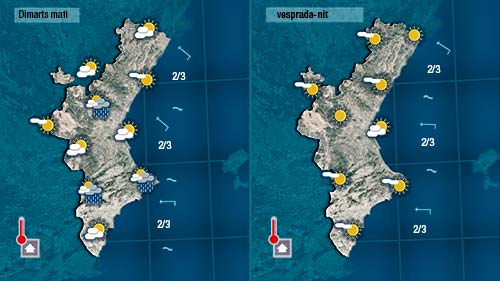 De fet, a primera hora de hui podria ploure dèbilment a les comarques ubicades al sud de València i al nord d’Alacant. Ruixats dèbils, puntulas i passagers. A partir d emig matí, envcara que els núvols no desapareguen del tot lluirà més el sol i fins i tot pujaran un poc les temperatures.