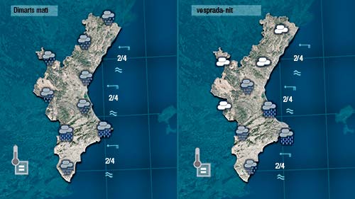 Demà dimarts escamparà al nord a partir de mig matí. Es ce encaraà es mantindrà cobert però les pluges seran dèbils o deixarà de ploure. Al sud encara s’espera que ploga de forma general i que localment encara ho puga fer amb intensitat moderada.