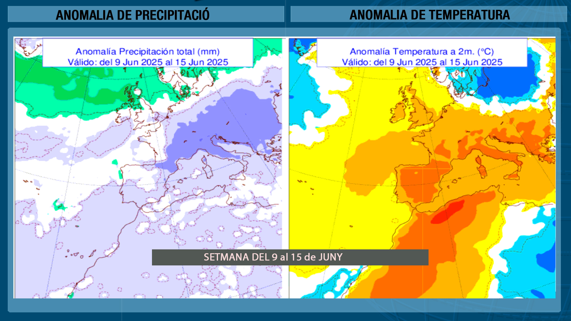 Per a hui els mapes de previsió ja donen probabilitat de ruixats al nord, a les rodalies dels Ports i de la Tinença mentre que a la resta lluirà el sol amb temperatures un poc més altes per la nit i també al centre del dia. No serà una setmana de calor en excés però el mapa de previsió setmanal d’Aemet mostra colors taronja a la major part de la Península sobretot al centre, mentre que  a la perifèria banyada per la mar els colors tot i ser taronja són més clars indicant l’efecte suavitzador de les temperatures d’aquelles zones banyades per la mar
