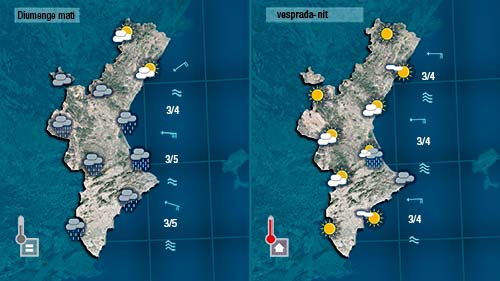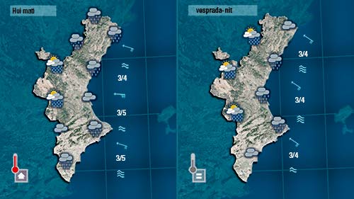 Al nord de la Comunitat els núvols encara es mostraran molt actius al llarg del matí sumant pluges allà on més ha plogut. Pel sud entradram entraran núvols deixant ruixats que localment podran ser moderats i en forma de tempesta. Hem de continuar alerta perquè quan plou sobre mullat l’escorrentia es genera en pocs minuts.