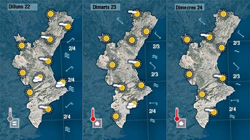 Dilluns hi haurà núvols a la costa, on el gregal encara es deixarà sentir. La mar continuarà prou alterada. Dimarts i dimecres sembla que recuperarem el sol i les temperatures pujaran un poc.