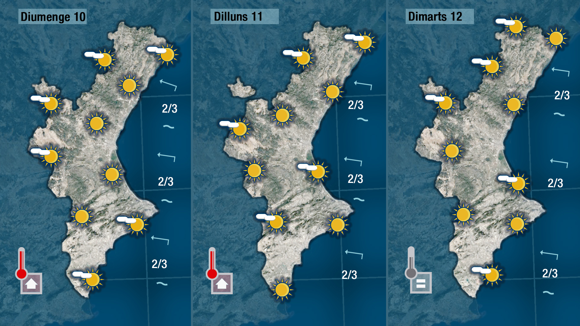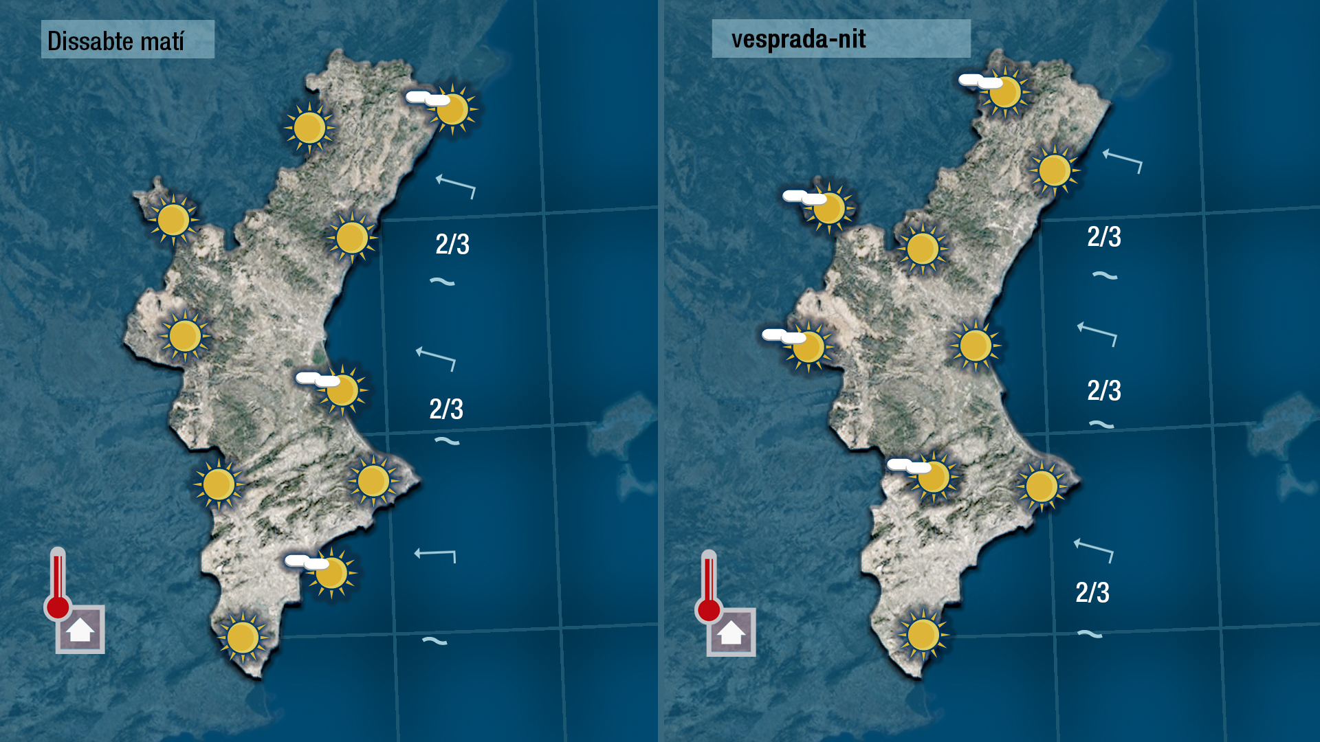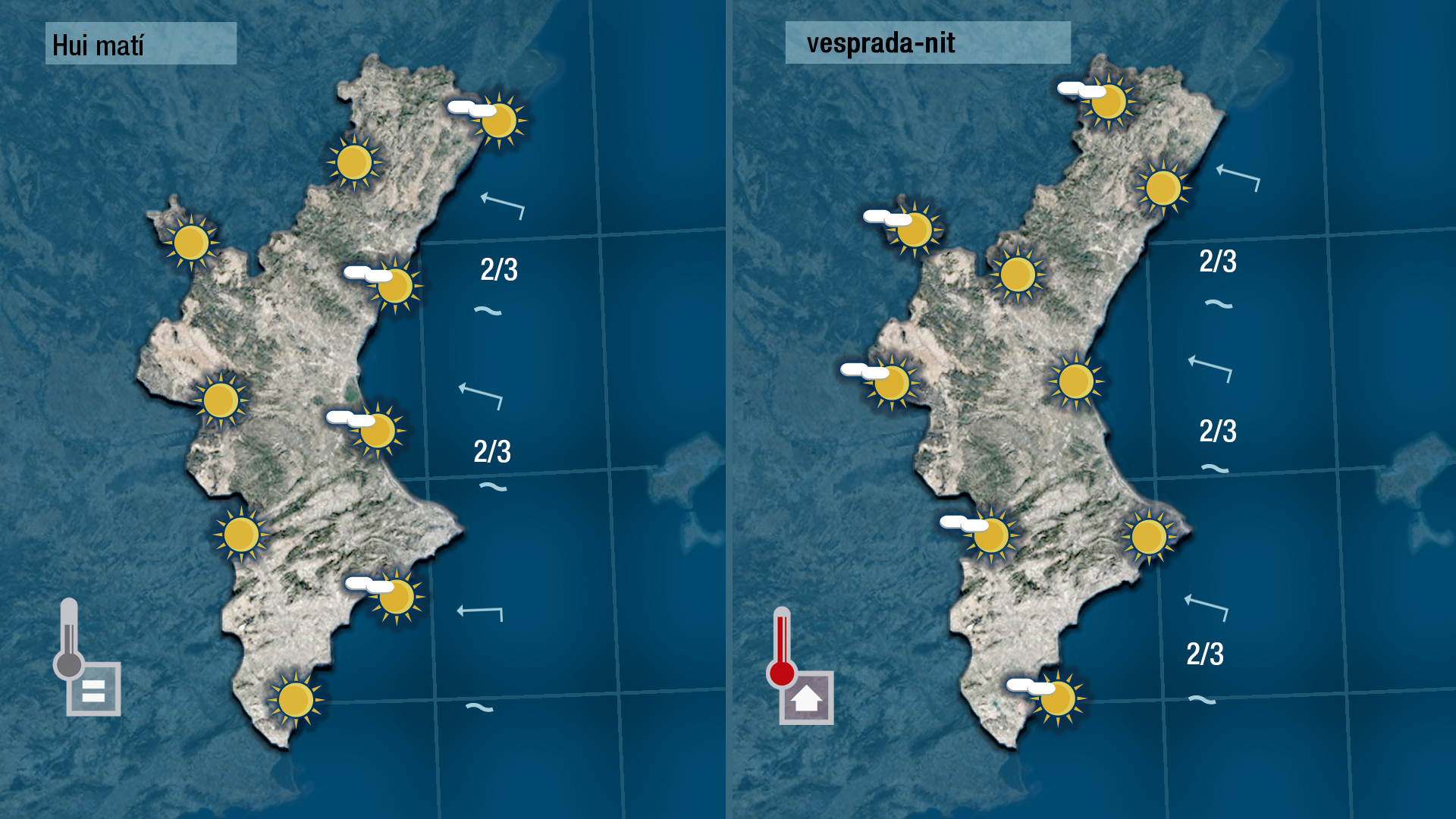 Hui vorem pocs núvols o cap al cel de la Comunitat Valenciana i les temperatures pujaran dos o tres graus respecte els valors dels últimes dies. L’ascens tèrmic serà més marcat al centre i per l’interior que a la costa on encara es deixa sentir a migdia l’efecte de la brisa.