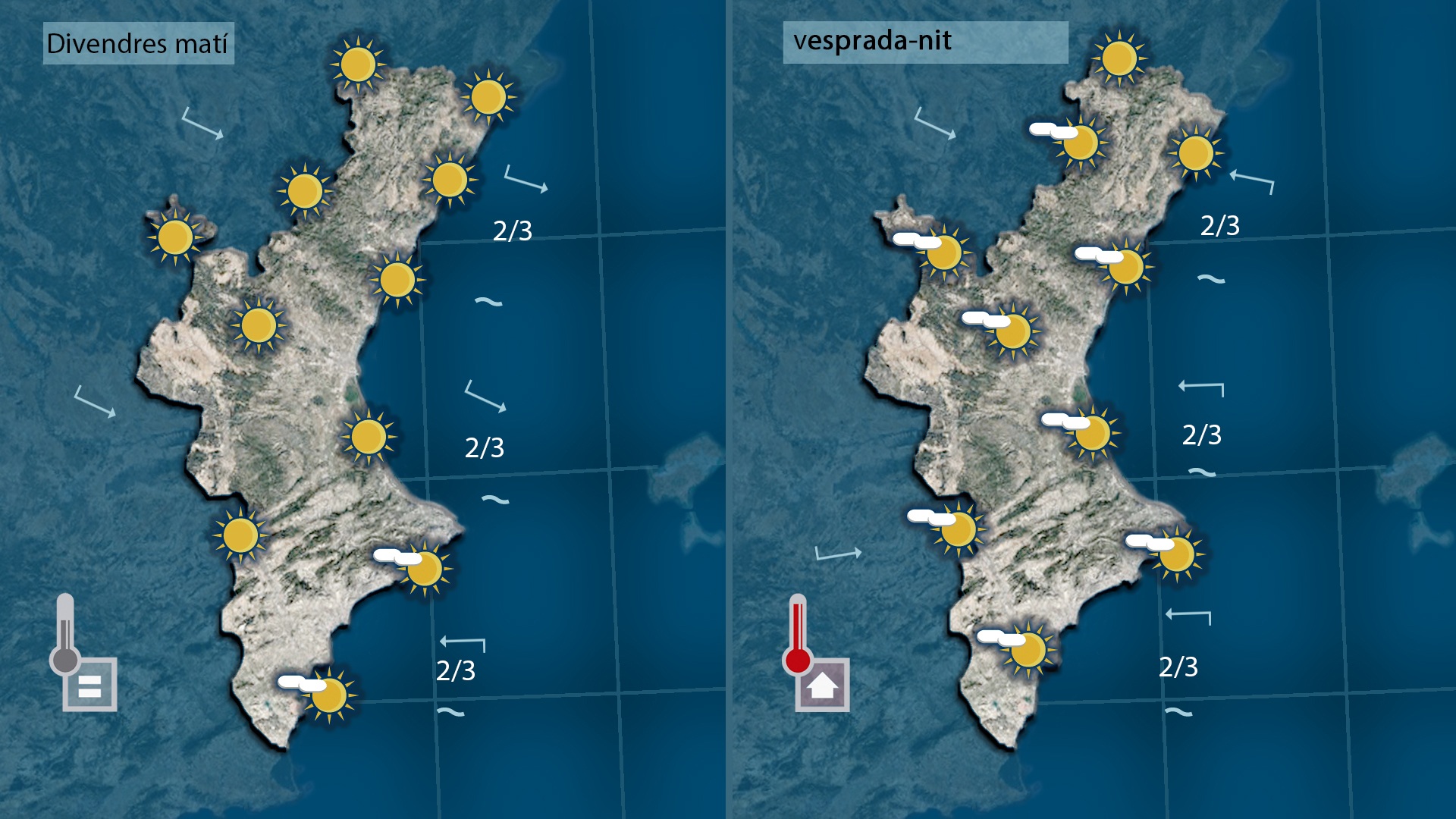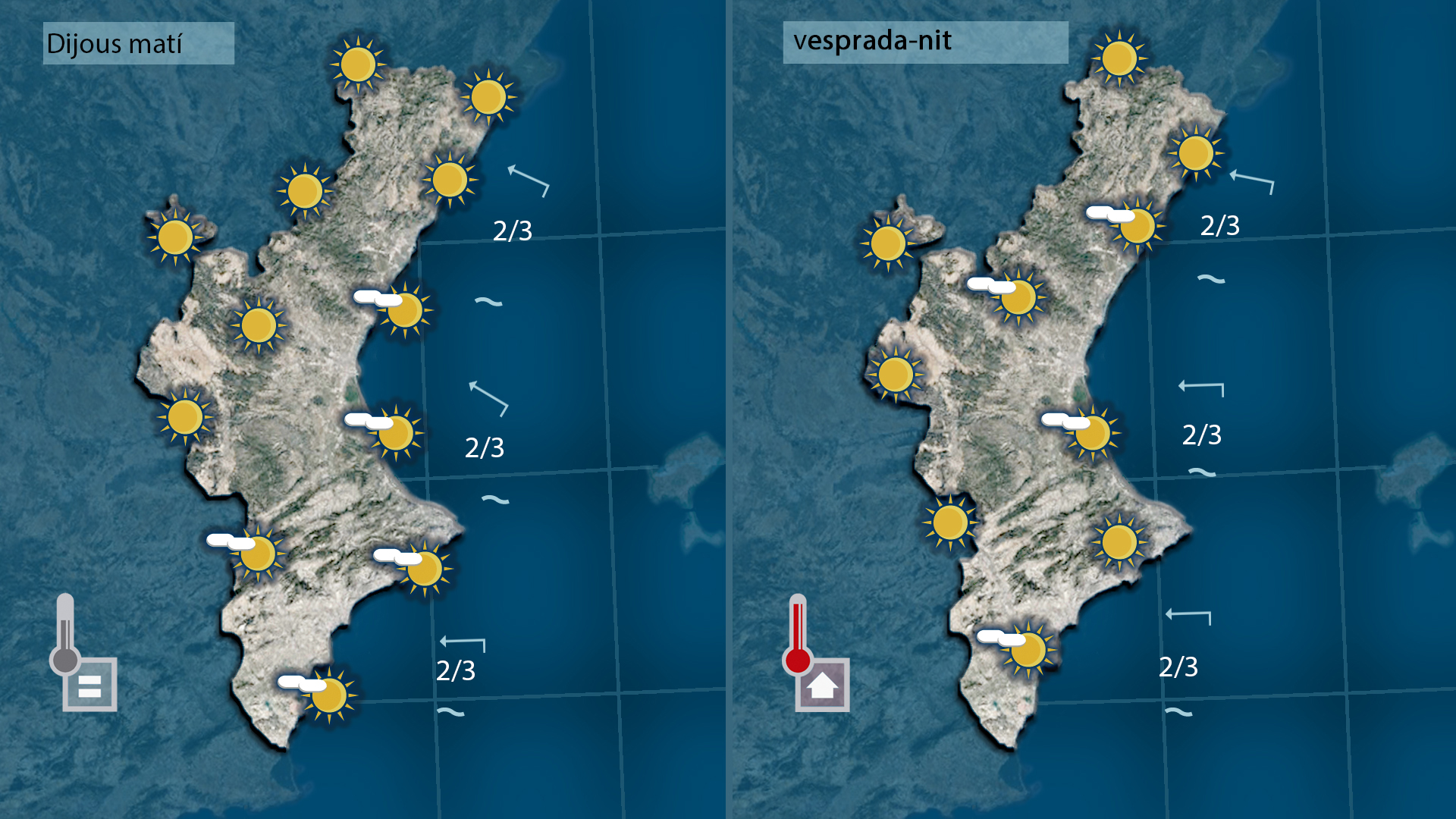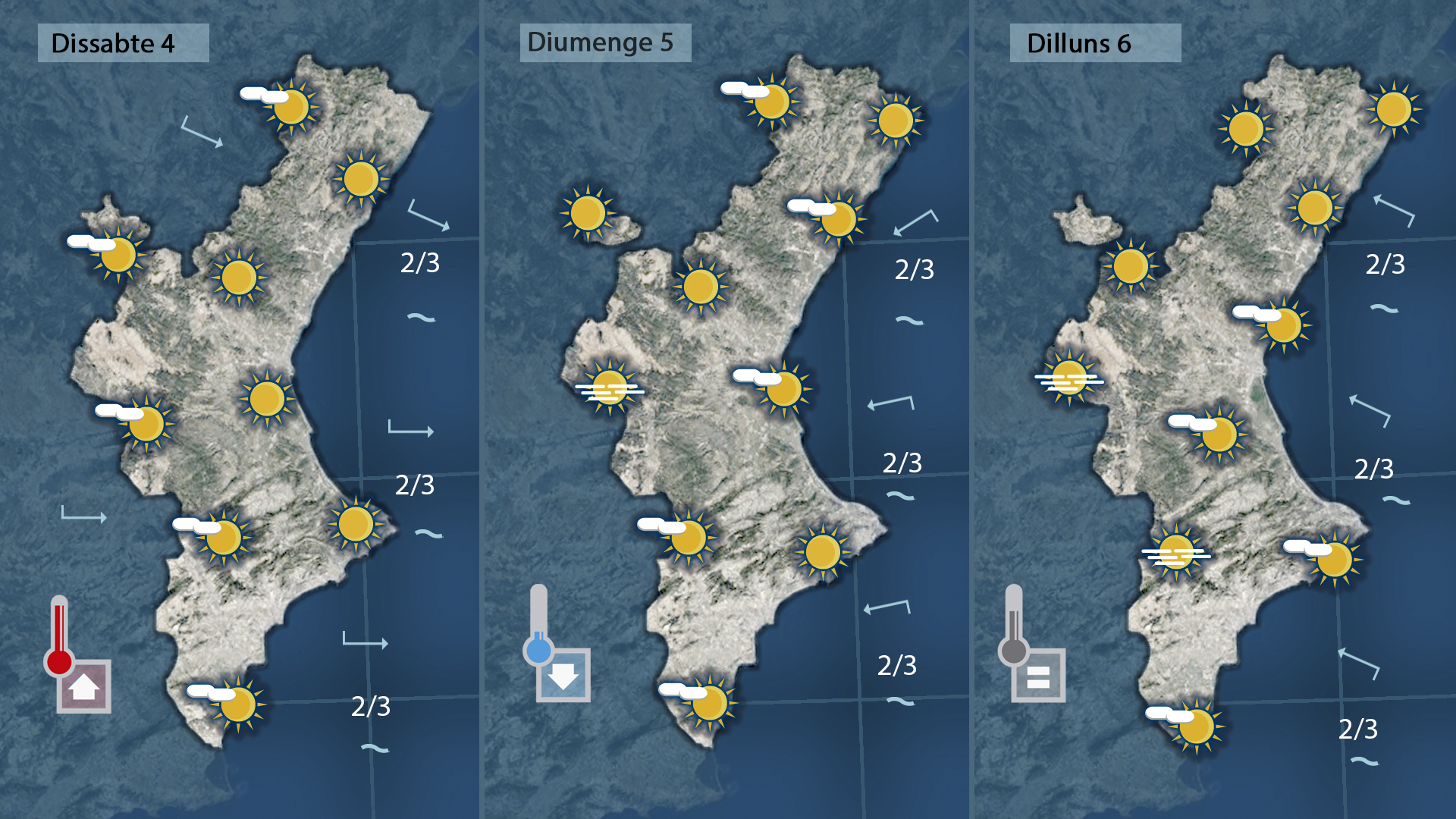 La segona part de la setmana no tindrà res a vore amb l’oratge que hem tingut fins ara perquè la nuvolositat va escampar a migdia ahir i des d’eixe moment el sol impera per tot arreu amb temperatures que es mantindran altes i fins i tot amb tendència a pujar