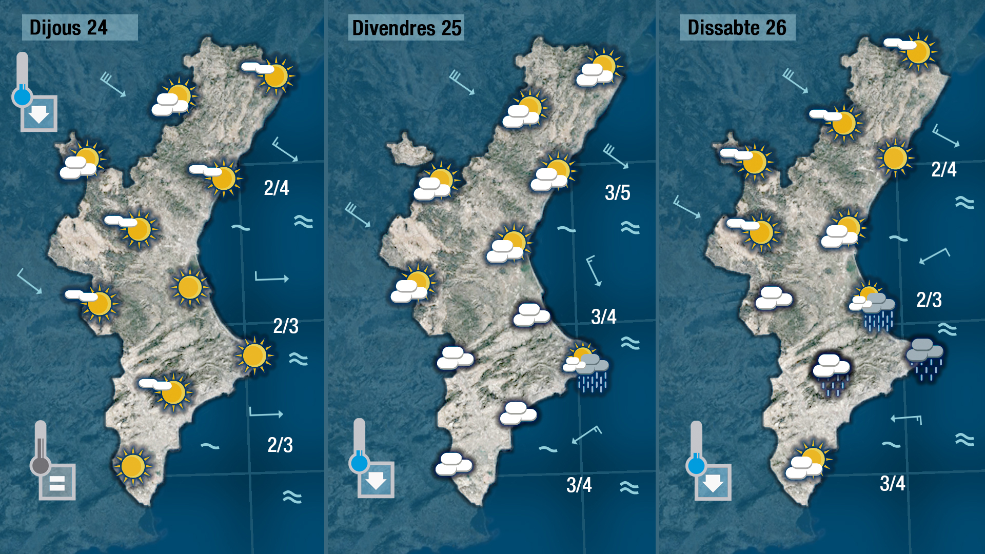 Dijous començarem a notar com baixen les temperatures de nord a sud. El mestral, sense bufar massa fort fins a última hira del dia afavorirà un descens de les temperatures que tindrà continuïtat divendres i dissabte.